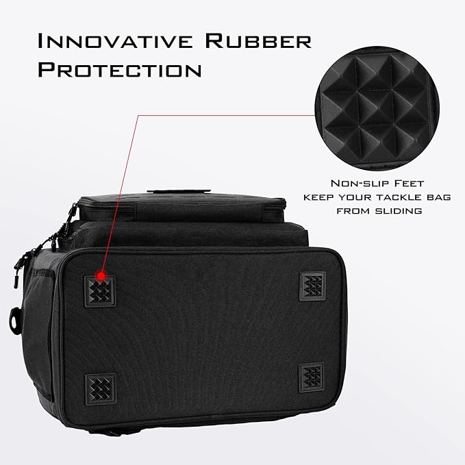 - TOUGH AND WATER RESISTANT – KastKing Karryall Tackle Bags are made of tear and abrasion resistant 600D oxford material, which provides exceptional long-term performance and reliability. The hydrophobic coating drains water from the outside and the inner PVC layer provides protection to ensure your fishing tackle is protected from the elements. The rubber non-slip foot pads grip any surface to ensure the bag doesn’t slide.