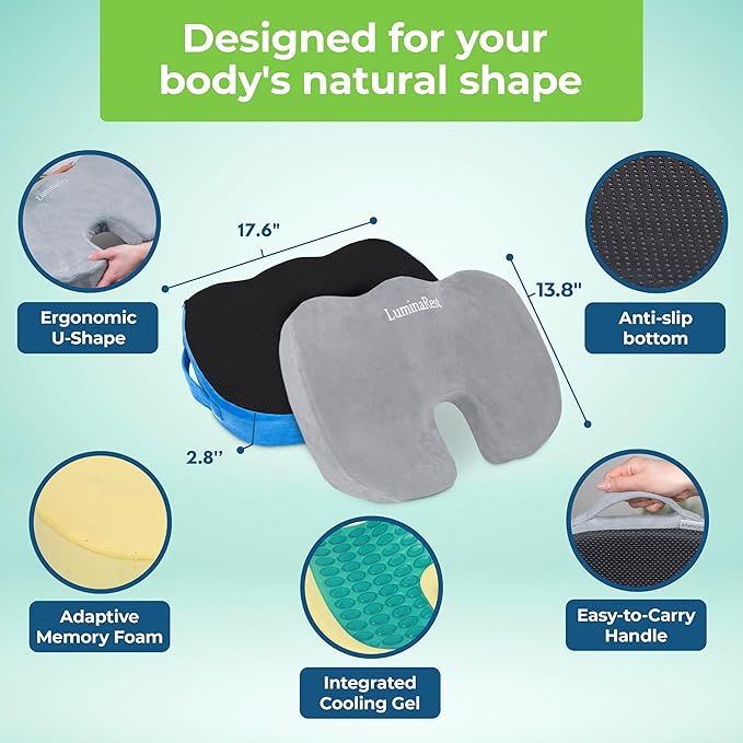 - Portable – LuminaRest gel seat cushion for office chair features a convenient carrying handle. Use it on your work chair, home chair, dining chair, gaming chair, car seat, airplane seat, or stadium bench. It’s a versatile companion for any activity involving extended periods of sitting while its non-slip bottom keeps it in place.