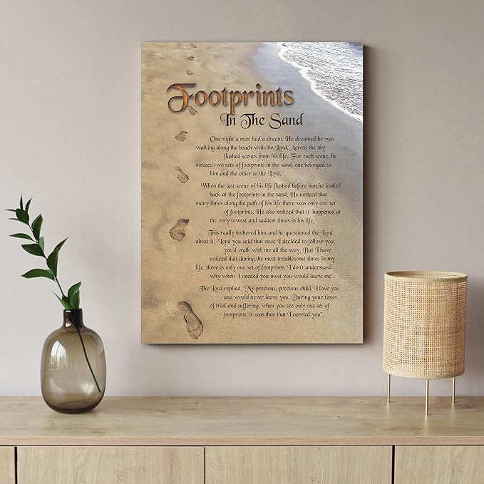 - 🌟 FOOTPRINTS IN THE SAND Artwork - Our "FOOTPRINTS IN THE SAND" canvas prints wall art have five common sizes that can turn any room into a focal point for a collection space. Canvas Wall Art poster size is 12 x 18 inches to 32 x 48 Inches. This Modern Christian Religious Poem canvas wall art measures 12x18 inches, Please measure the wall to choose the right canvas size before purchasing! Shop our wide selection of canvas wall art by color, size, or style!
