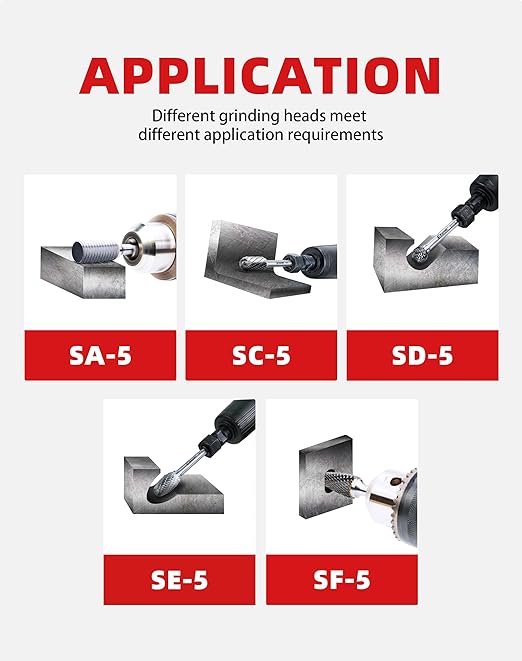 - 【Must Have Carbide Burr Set】5PCS EZARC Carbide rotary burr set include SD-5, SE-5, SF-5, SC-5, SA-5. Size: 2-3/4" Total length, 1/4" shank diameter, 1/2" cutter diameter, 1" length of cut. Customized Tungsten Carbide Rotary Burr Bits for Professional Users