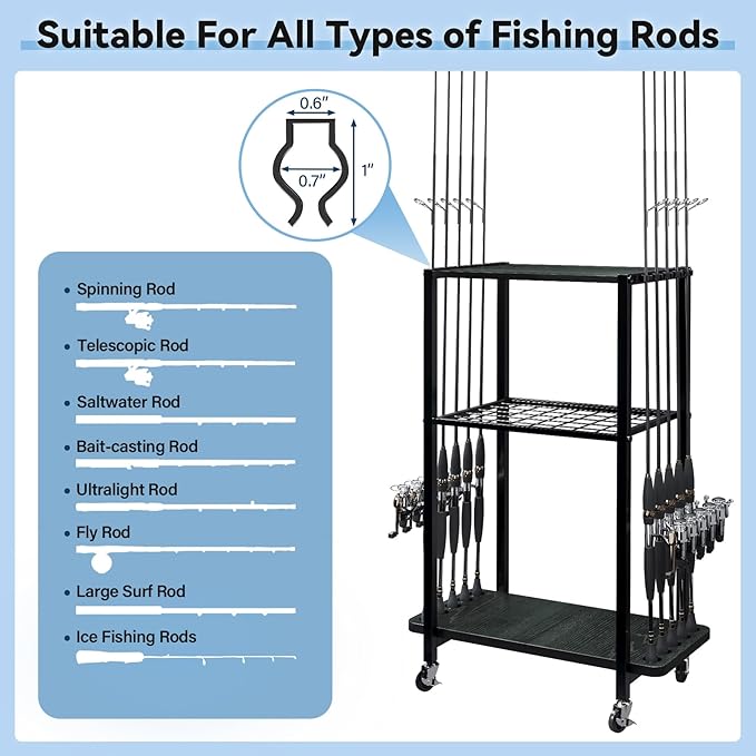 - 【Fishing 10-Rod Holder Rack】This fishing rod rack can hold up to 10 fishing rods. With three layers of shelves, it provides ample space for storing fishing baits, fishing gear and accessories. Equipped with a roller design, it is easy to push without the need for strenuous handling. Made of high-quality materials, it ensures long-term use