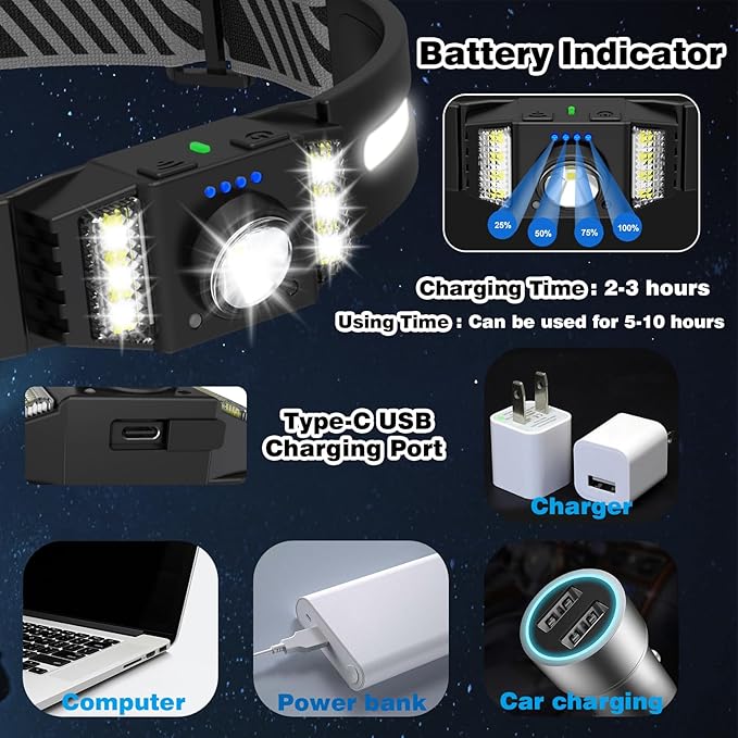 - 【Type-C Charging】Built-in 1500mAh rechargeable lithium battery and Type-C USB input port, the headlamp can be charged through computers, car chargers and mobile power supplies. 4 battery indicators let you know the remaining power in real time.