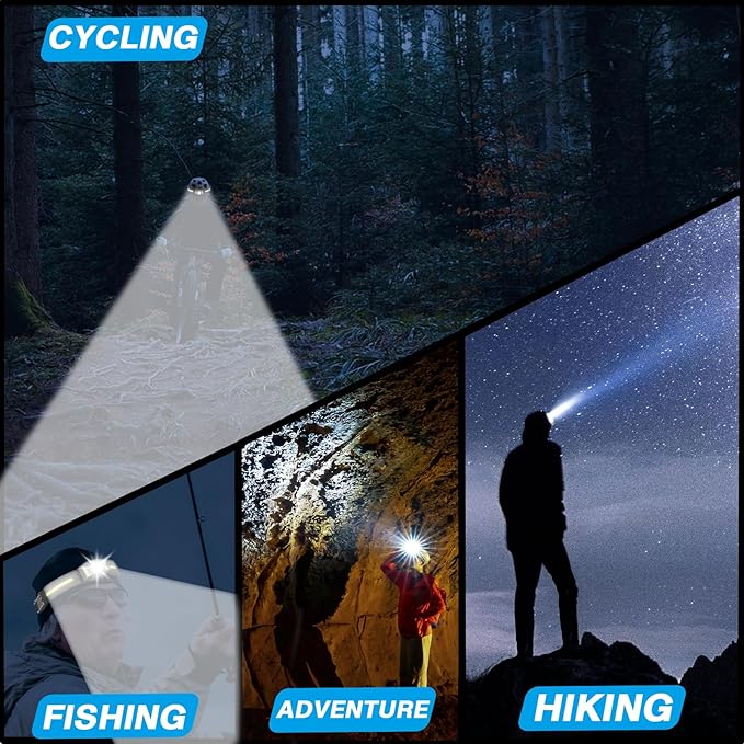 - 【9 Light Modes】The hands-free headlamp has 9 light modes to meet your various needs. Press the power button to cycle through the display, XPG LED light (high/low) - COB white light + SMD white light - SMD white light - SMD red light - SMD red light flashing. Double-click the power button to enter strobe mode-SOS mode-beacon mode.