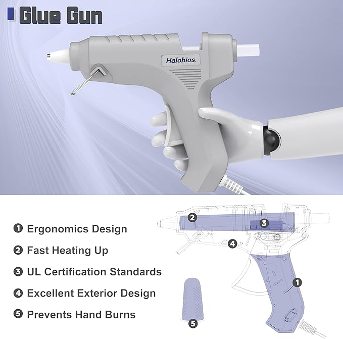 - ➤【High Quality & Safe】Comply with UL certification standards. The glue gun is comfortable to hold and can be preheated when plugged in. It is plug-and-play and easy to use. Built-in fuse prevents it from overheating. Using High-Quality Nozzle, the Glue Gun will not deform even after long-term use at high temperatures. It includes three heat-resistant finger caps to provide an extra layer of protection while using the glue gun, thus avoiding accidental burns.