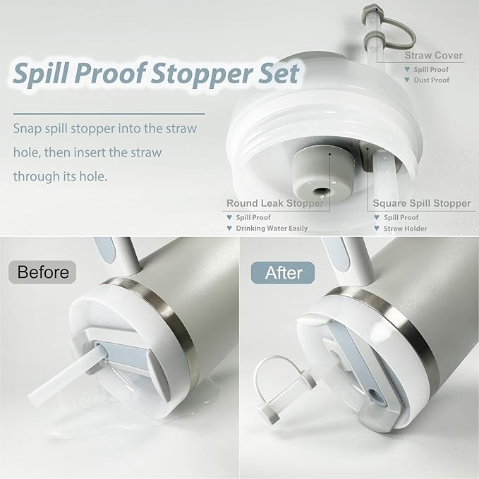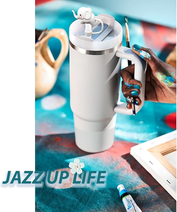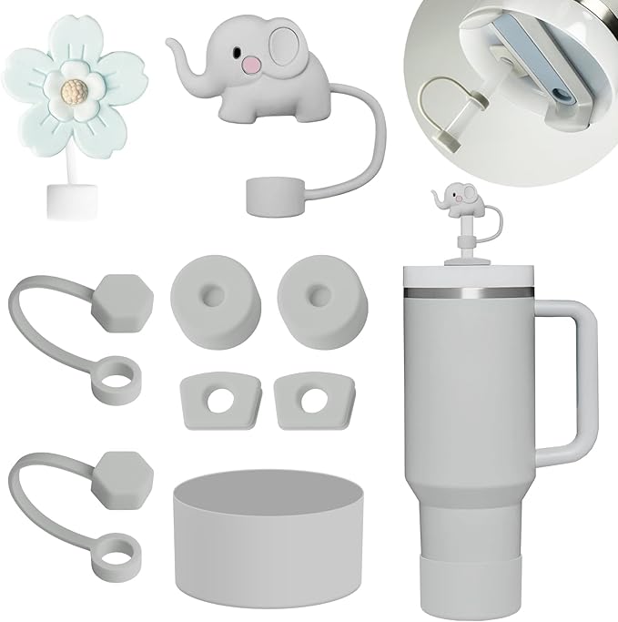 - Package Includes - The stanley cup accessories set includes 2 hexagon spill stoppers, 2 square spill stoppers and 2 round lid leak stoppers, 1 pcs elephant straw topper and 1 pcs flower straw cover, 1pcs fog silicone boot sleeve, specially designed for Stanley Adventure Quencher 40oz and Stanley IceFlow 20oz 30oz tumblers water bottles. Straw covers match for 9-10mm straws.