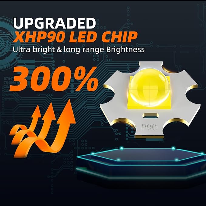 - High Powered Flashlight: The bright flashlight built in upgrade super bright LED chips, which is 36w, max 10000 lumens in turbo mode, max beam 350 m / 1148 ft. Brighter than headlight of car, perfect for camping, hiking, traveling, checking, working, machenic, adventuring, dog walking, night riding, pathfinding, patrolling, fishing, etc