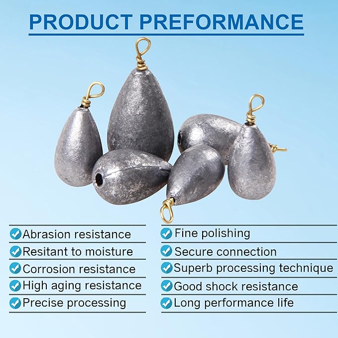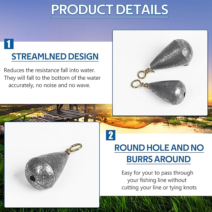 - TEARDROP SHAPE-Fishing weights sinkers featured a teardrop shape,that could make sure fast sinking speed,low falling resistance, in the bottom of the water can effectively reduce resistance and make it easy to drop into water, a nice accessory for bottom
