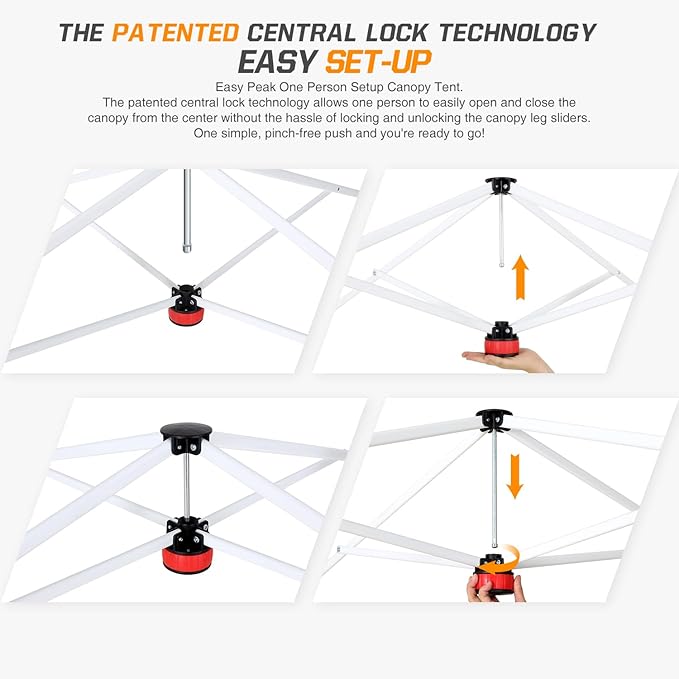- EASY SETUP: This easy setup pop up canopy tent features the Peak Push system, a patented canopy center lock. The portable canopy requires no tools and easily opens and closes from the center in seconds. Its unique canopy tent center lock enables a quick, one person setup, letting you maximize outdoor time with minimal effort