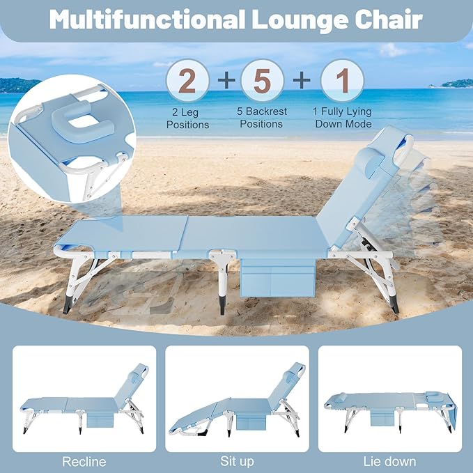 - Versatile Comfort: Our design includes a open/close face cavity and arm holes, offering flexibility for lounging on your back or stomach. With 5 adjustable positions, it transforms into your personal oasis – a portable tanning bed, a massage table, or a convenient reading chair on the go