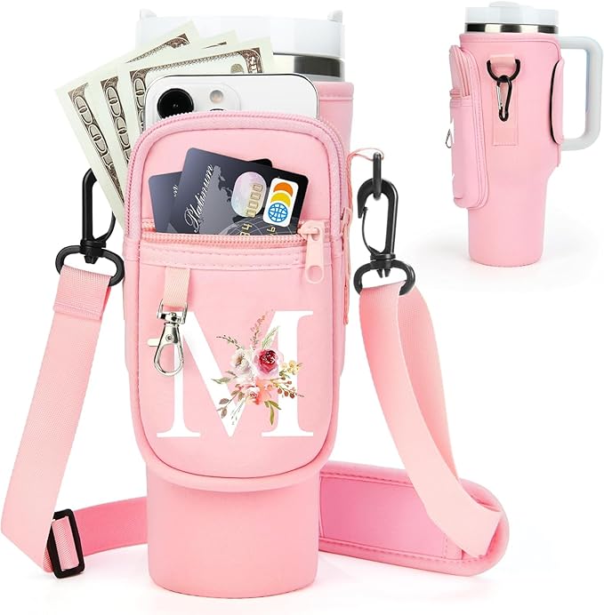 Initial Water Bottle Holder with Strap for Stanley 40 oz Tumbler/Simple Modern 40 oz Tumbler,Water Bottle Carrier Bag with Strap,Personalized A-Z Phone Pocket for Stanley Cup Accessories