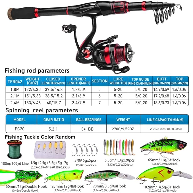 - FISHING ROD AND REEL COMBOS: including 1 fishing rod + 1 fishing reel + fishing line + various fishing lures with hooks + carrier bag. this complete spinning fishing rod and reel combo is specially made for novice, including necessary fishing accessories.