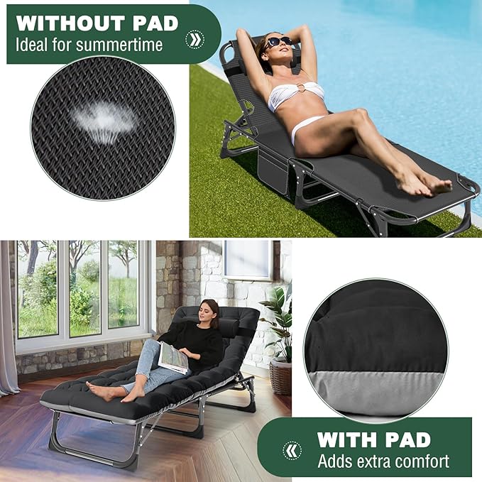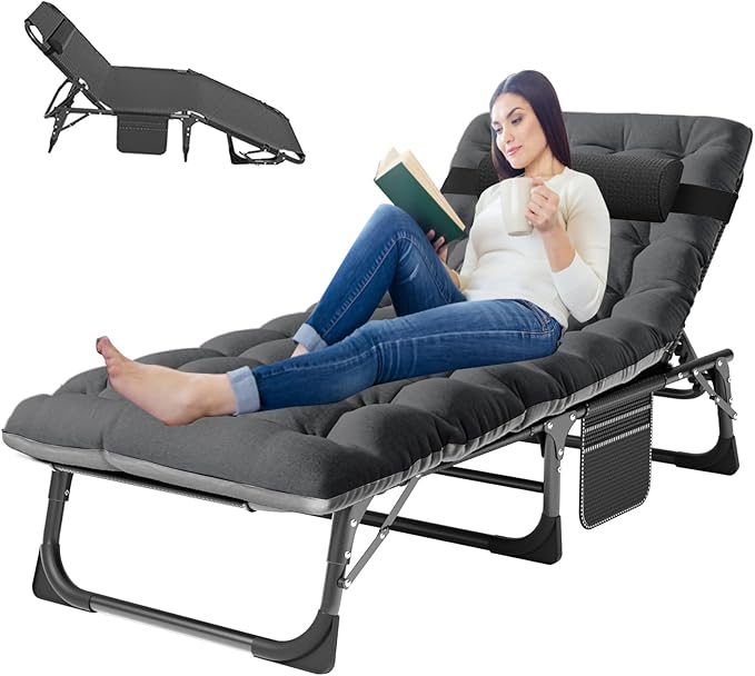 - DESIGNED FOR COMFORT: With a perfect balance of a firm and soft surface, our chaise lounge boasts an ergonomic design to help reduce muscle tension and stress; The beach lounger chair has a side pocket, to place your phone, books or keys; the pillow is detachable, can be adjustable up and down or removed based on your own needs;