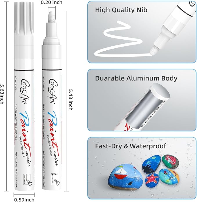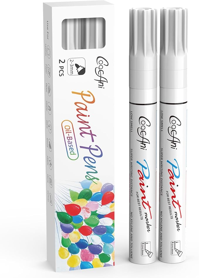 White Paint Pens Paint Markers, 2 Pack Oil Based Permanent Markers With 2-3mm Medium Point Tip For Rock Painting, Wood, Plastic, Metal, Canvas, Mugs Art Supplier (White,2 Pack)