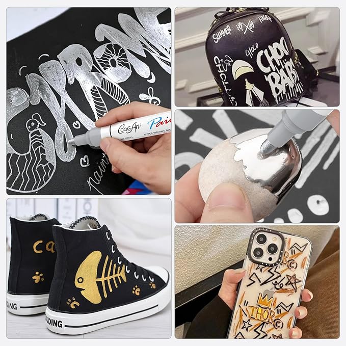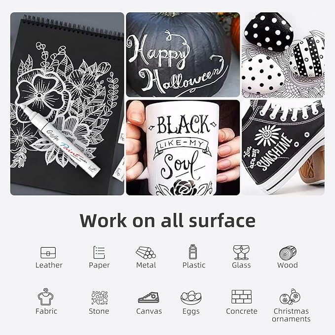 - šćMulti-PurposećThese paint pens works on almost any surfaces, such as metal,glass,plastic,canvas,stone, paper, ceramic, rock, fabric,mug,wood etc. Perfect for DIY projects, card marking, journals, planners, coloring books,scrapbooks etc.