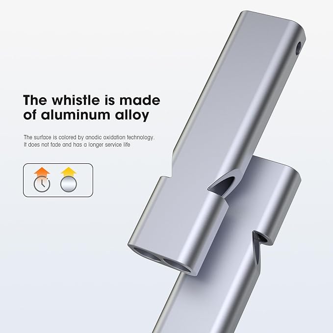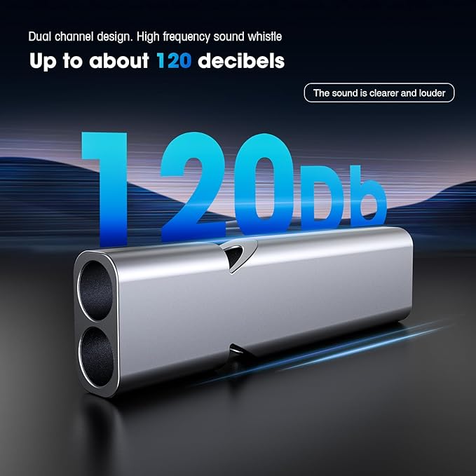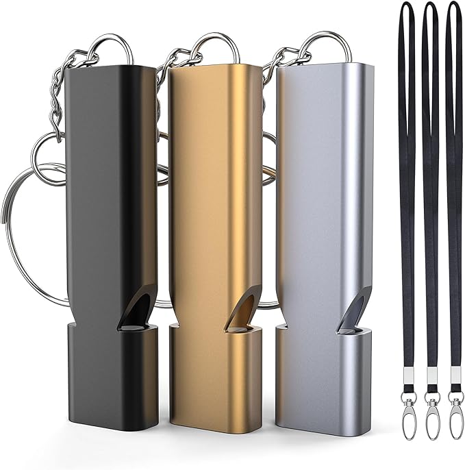 - 3-Pack Camping Signal Whistles, featuring a super loud double-tube design that reaches up to 120 decibels. Crafted from premium aluminum alloy for durability, with key chains and hanging ropes for easy portability.