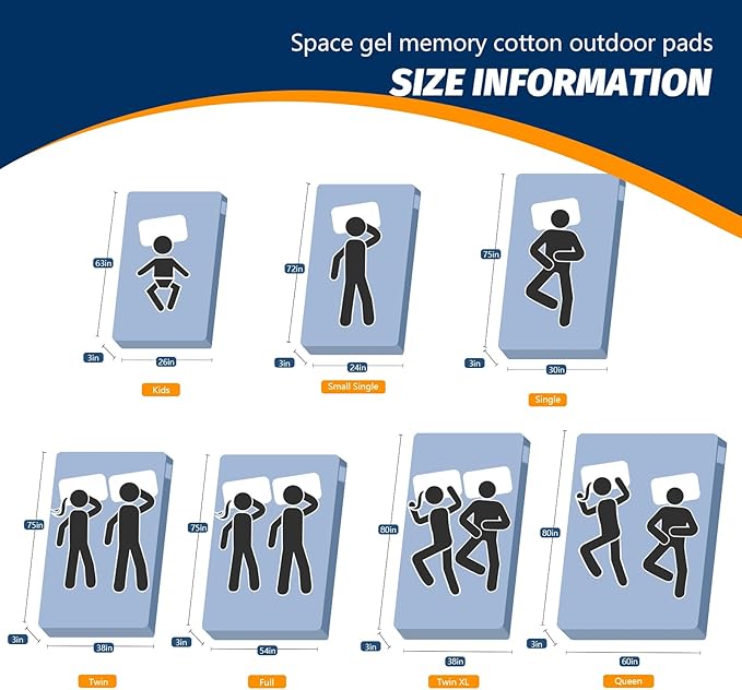 - 【MULTI-SIZE OPTIONAL & AFTER-SALES SERVICE WITHIN 24 HOURS】 5 sizes for you to choose from camping mattress full size, kids (63x26x3") small single (72x24x3”) single (75x30x3”) twin (75x38x3”) twin xl size (80x38x3”), Be sure to choose the most suitable size. Since we shipped by vacuum compression packaging, please Open the package and place it for about 24-48hours. If you have any question, feel free to contact us. Please believe that we will solve the problem for you within 24 hours.