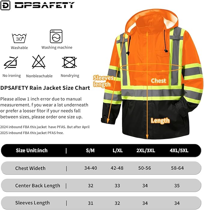 - HIGH VISIBILITY RAIN JACKET CLASS 3: DPSAFETY Rain Jacket is made of fluorescent yellow high visibility rain coat background material and high visibility reflective tape, achieving Class 3 visibility and providing 360 ° visibility at night or in low light environments.