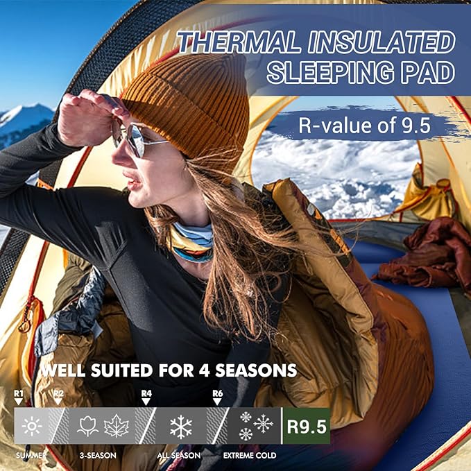 - Suitable for All Seasons: This insulated sleeping pad owns an R-value of 9.5 after industry standard ASTM test, which means it has superb insulation capacity, with the moisture-proof and breathable properties of the fabric, it will insulate you from the harsh external environment, warm in winter and cool in summer. Such a thick car sleeping pad weighs only 8.1lbs, and each sleeping pad comes with a shoulder storage bag, ideal for family camping, car camping, road trip, or for guests at home.