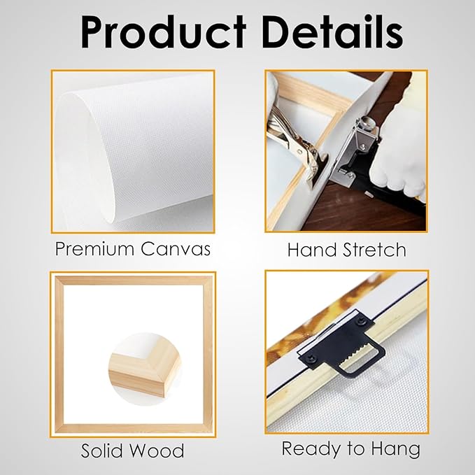 - Each decorative painting comes with a wooden frame, and the canvas-wrapped wooden frame comes with a metal hook on the back for hanging.