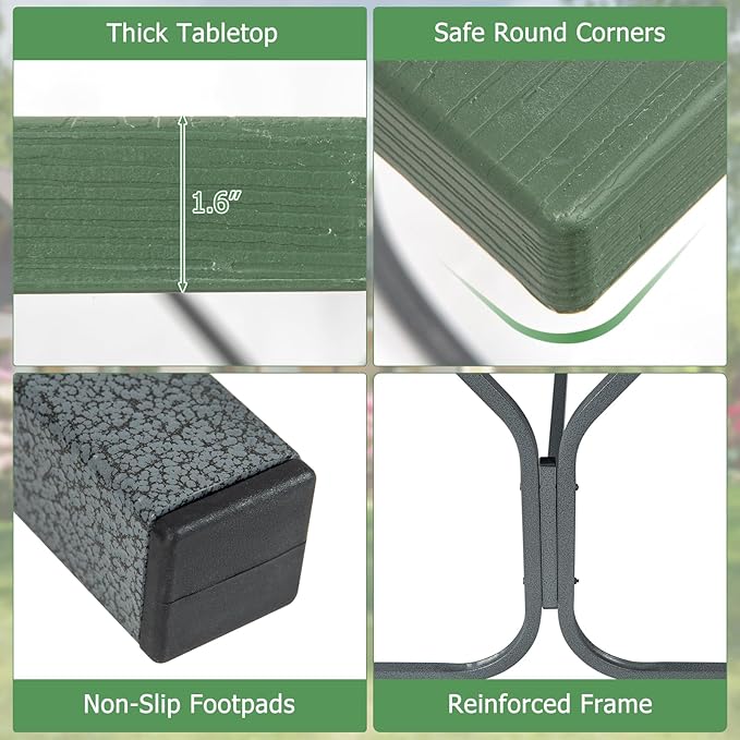 - Durable & Premium HDPE Tabletop: The tabletop of the picnic table is crafted of premium HDPE material, which is not easy to crack or fade and can resist sunlight, ensuring long-term outdoor use. And its delicate wood-like texture adds a touch of elegance to your outdoor space.