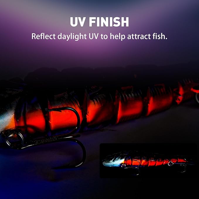 - Enhancing Fish Attractiveness: Equipped with 2 built-in stainless steel balls can guarantee steady swimming action. The UV-painted finish enhances visibility in low-light conditions, such as sunrise and dusk. These features maximize the M1 multi-jointed swimbait's ability to attract target fish, making it an essential tool for anglers.
