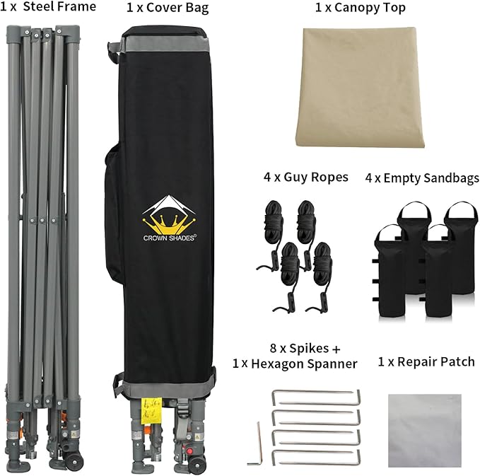 - HIGH GRADE STEEL FRAME - The durable, high-grade, corrosion-resistant steel truss frame with hardened through bolts comes pre-assembled and can be set up without any tools. Engineered to support up to 120 lbs. distributed across the frame, it ensures robust and reliable performance. The extended ceiling assembly and upgraded high peak design make it easier for rainwater to run off, preventing water pooling on the canopy. Perfect for extended outdoor use at markets, festivals, and exhibitions