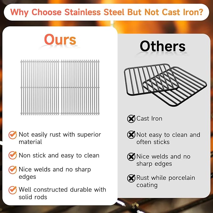 - Easy to Clean: Stainless steel cooking grill grates is smooth and non-stick, after use only need to use water with detergent gently brushing can be perfectly cleaned, better than cast iron mesh easier to clean