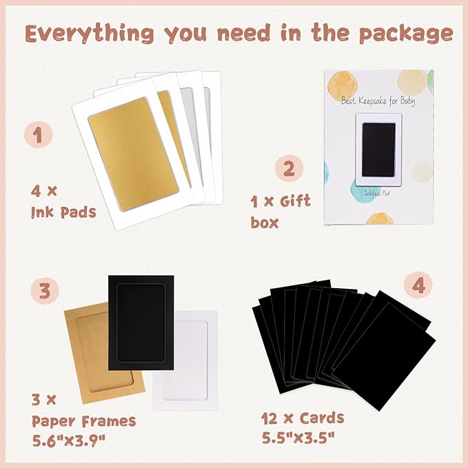 - 【Product Details】: Our baby hand and footprint kit measures 5.0"x3.2" with an ink window of 3.7"x2.3", which is the best size for recording hand and footprints of newborns 0-6 months old or pet paw prints . The ink pad for baby hand and footprints includes 4 clean touch ink pads, 12 stamping cards, and 3 display frames, ensuring you have ample opportunity to capture the best stamp.