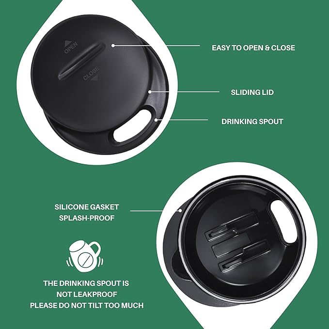 - 【PRESS-IN LID】- Silica gasket seals to achieve maximum spillproof capability. Drinking hole on the top, with a splash-proof sliding cover. Please note it is to keep drinks contained and prevent heat/cold from escaping. It is not leakproof.