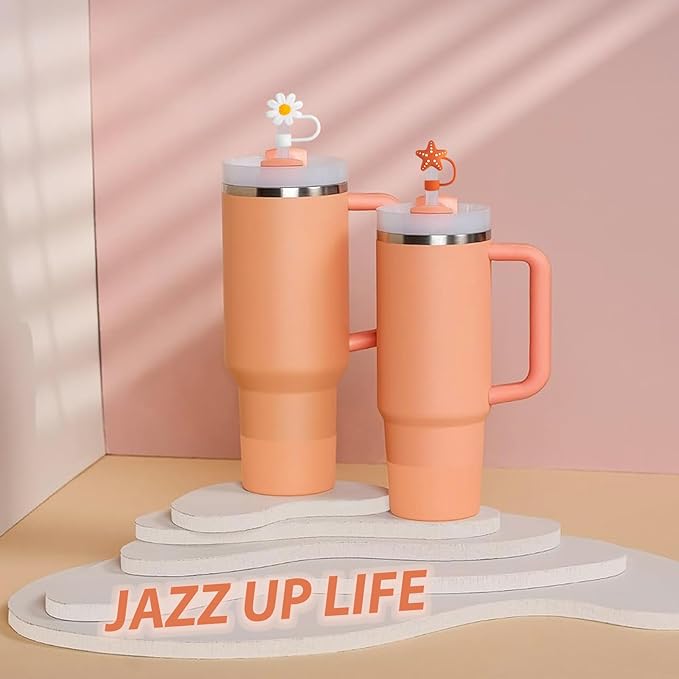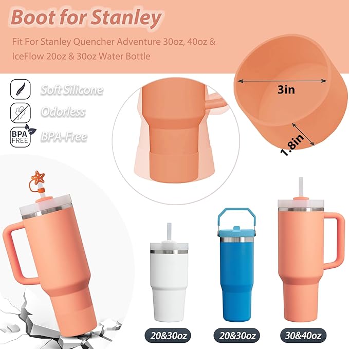 - Package Includes - The stanley cup accessories set includes 2 hexagon spill stoppers, 2 square spill stoppers and 2 round lid leak stoppers, 1 pcs flower straw topper and 1 pcs starfish straw cover, 1pcs nectarine silicone boot sleeve, specially designed for Stanley Adventure Quencher 40oz and Stanley IceFlow 20oz 30oz tumblers water bottles. Straw covers match for 9-10mm straws.