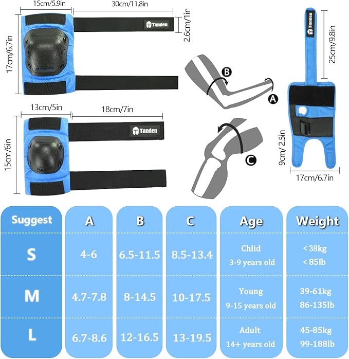 - Adjustable Size - Our medium size is best suited for youth aged 9 to 15 years old. Equipped with several adjustable, elastic straps for a customizable fit, this youth skateboard pads guarantees unrestricted movement during sports.