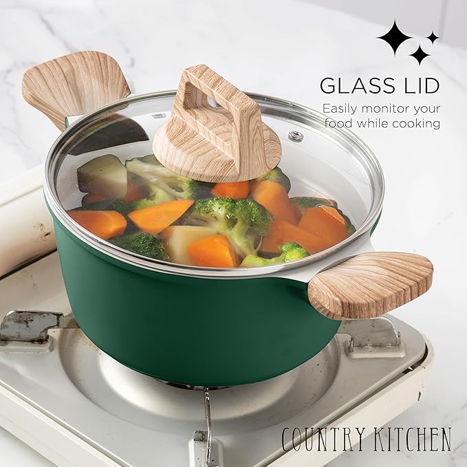 - SET INCLUDES - A complete kitchen essentials set, you're getting a total of 10 cookware pieces and 4 silicone utensils. Including an 3 qt casserole pot with glass lid, a 4 qt casserole pot with glass lid, a steamer, an 11” frying pan, an 8” frying pan, a 11" deep frying pan with glass lid, and a 2 qt sauce pan with glass lid. These beautiful cookware sets are designed with a speckled coating and woodlike handle. Not only functional, but these sauté pans are decorative as well.