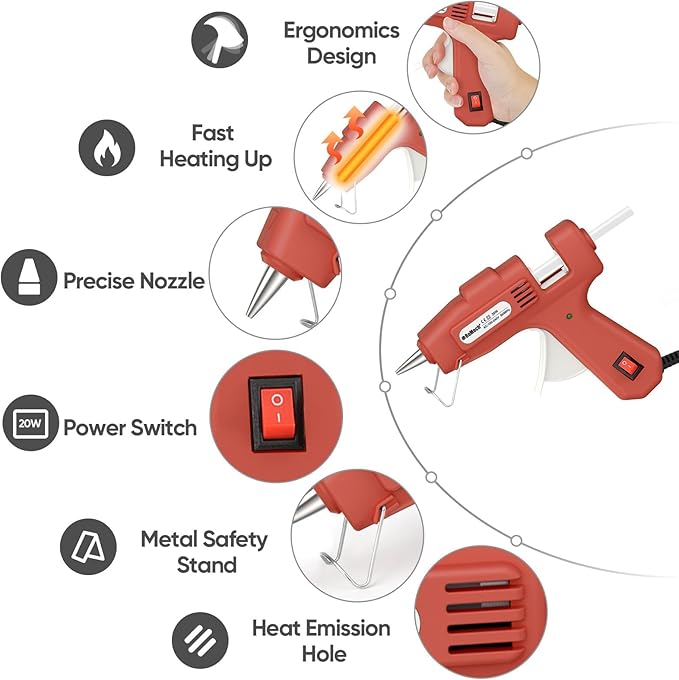 - [EASY TO USE] The handle is ergonomically designed to ensure comfort even during extended use. The operation is very simple, just insert the glue stick into the hot glue gun, gently press the trigger to preheat for 2-3 minutes, and then release the melted glue. Start your DIY now!