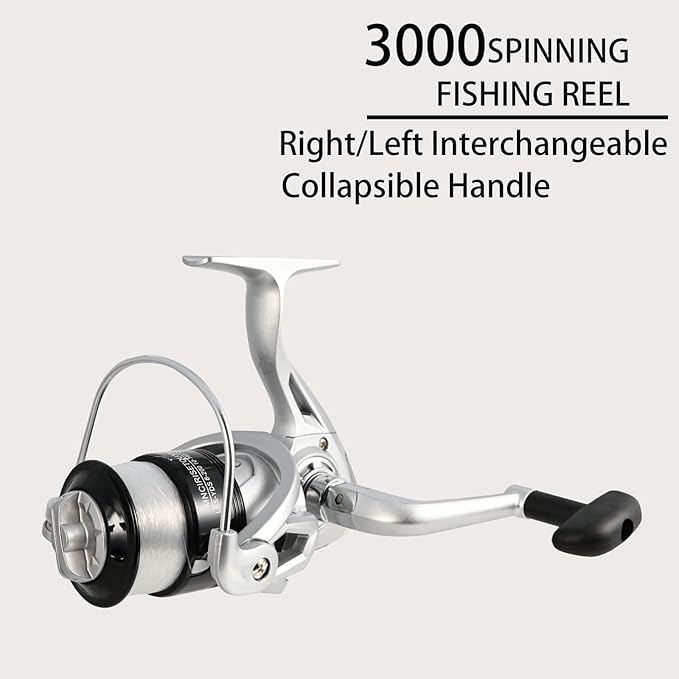 - 【2 x Powerful 3000 Spinning Reels】The spinning fishing reels has a folding design, and a more comfortable handshake. The reverse stop switch controls the forward and reverse rotation of the fishing wheel. The rocker arms can be exchanged left and right to meet different user habits.