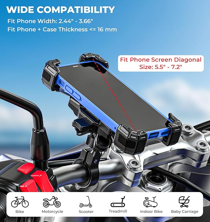 - universal Compatibility: By adjusting the screws at the bottom of the cell phone holder, you can match different widths of cell phones. The motorcycle phone mount is suitable for cell phones(Case Included) with length of 135 mm - 174.5 mm(5.31" - 6.87"), widths of 62 mm - 93 mm(2.44" - 3.66"), compatible up to a maximum thickness of 16 mm(0.63"), and compatible with phone screen diagonal size of 5.5" - 7.2"