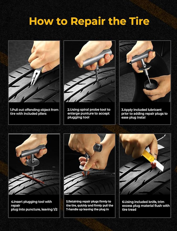 - Durable and Safe: The tire puncture repair set has great adhesion, flexibility, shock absorption, and is not easy to age, providing a long shelf life. It can withstand the toughest repairing and achieve the best tire air tightness.