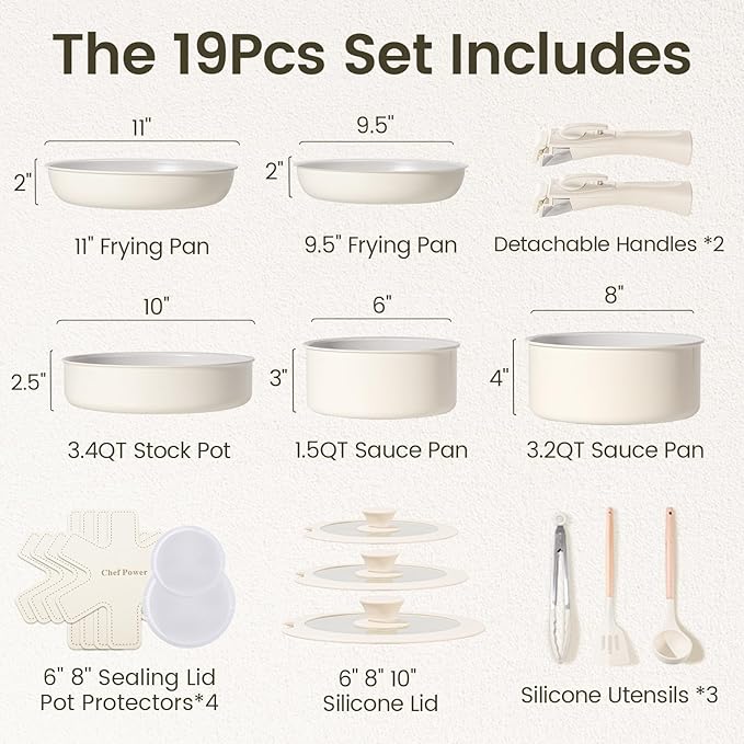 - 19 Pcs Cookware Set Includes- 1.5 QT SAUCEPAN, 3.2 QT SAUCEPAN, 3.4 QT STOCK POT, 9” FRYING PAN, 11” FRYING PAN, 6”-8”-10” SILICONE LIDS, DETACHABLE HANDLE* 2, SILICONE SLOTTED TURNER, SILICONE LADLE, SILICONE LOCKING TONG, POT PROTECTORS*4