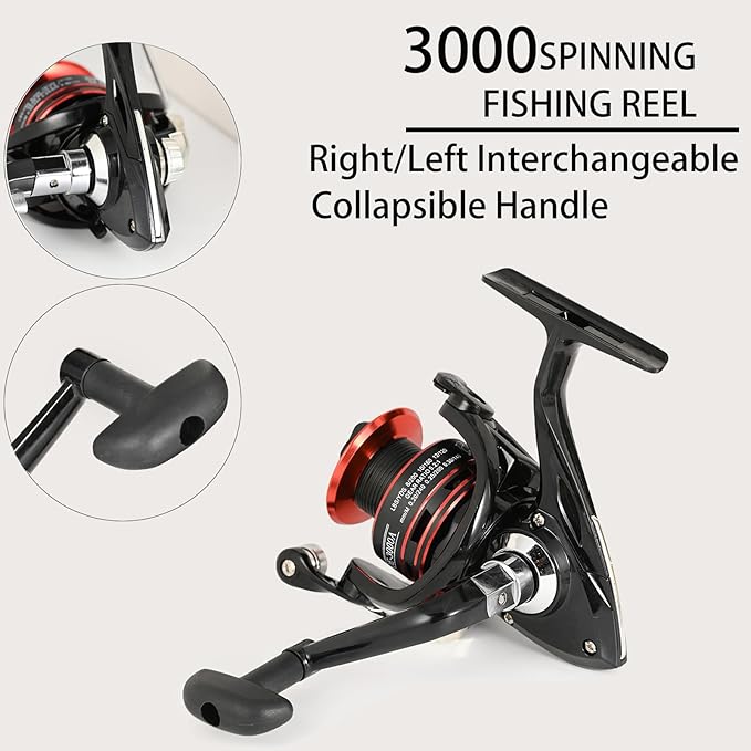 - 【2 x Powerful 3000 Spinning Reels】The spinning fishing reels has a folding design, and a more comfortable handshake. The reverse stop switch controls the forward and reverse rotation of the fishing wheel. The rocker arms can be exchanged left and right to meet different user habits.