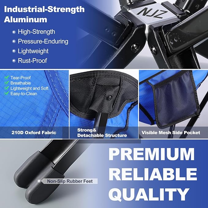 - Quick Setup: The NJZ portable camping chair is a one piece construction that simply opens for use. Comes with instruction manual and operating video for quick setup in just seconds. Note: The buttons may be tight initially but will loosen after 8 uses