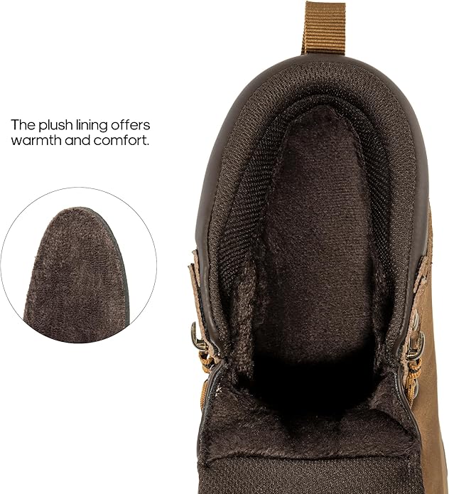 - Warm Lining: The short plush lining in these men's cold-weather boots combined with 3M thermal materials on the insole provides exceptional warmth and insulation, keeping feet cozy in cold conditions.