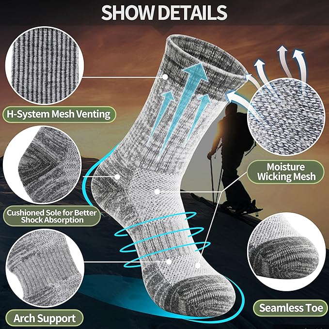 - Moisture Wicking:By designing with ventilation mesh function,these wool hiking boot socks are breathable,which keep feet dry fast quickly and have great help in odor repelling.They are suitable for hiking , running ,outdoor walking , trekking or working.