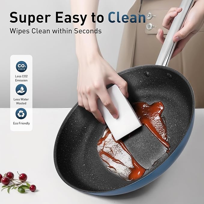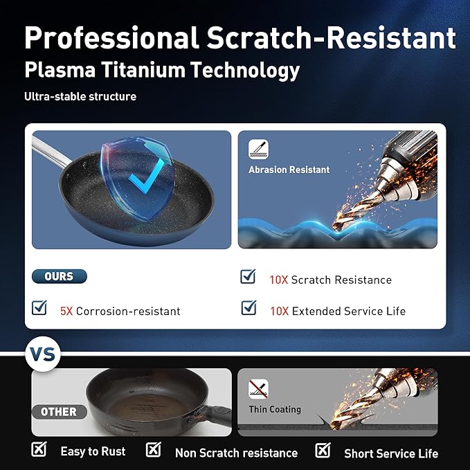 - 【Healthy Coating】: Non-stick cookware using plasma titanium and other high-tech composite material surface treatment, completely free of PFAS, PFOA, and other harmful substances, have better wear resistance and high temperature resistance performance