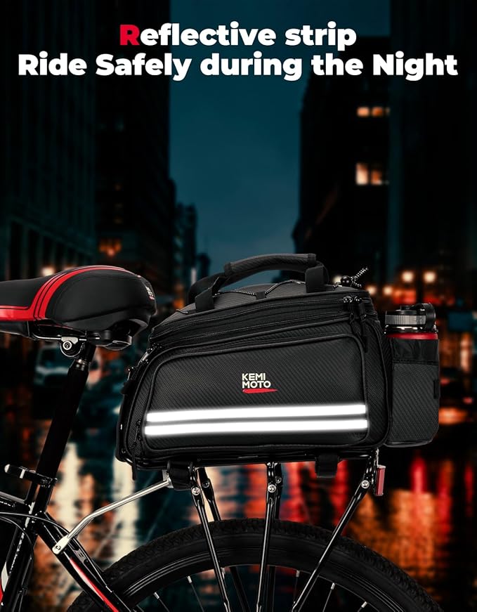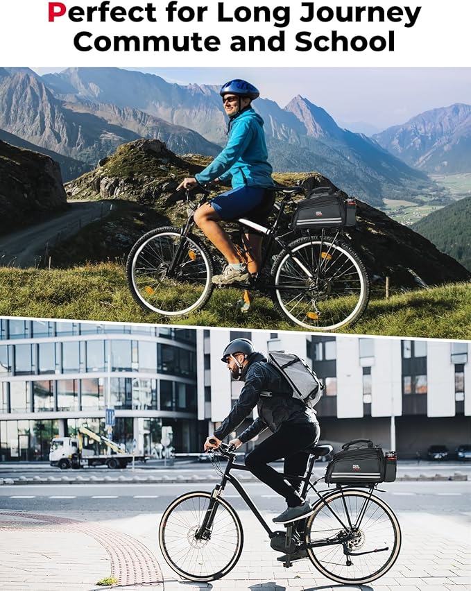 - Water Resistant Carbon Leather PVC: The bike rear rack bag is made of 600D carbon fiber with a water resistant pvc membrane coating. It also comes with a removable rain cover to keep your bag's contents dry in the rain