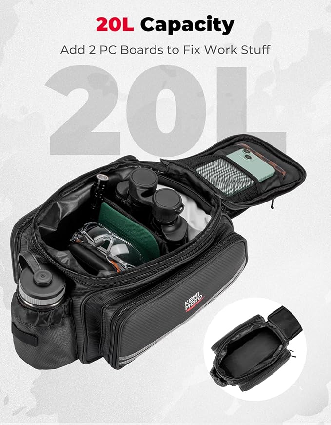 - Foldable 20L Capacity: The overall capacity of the KEMIMOTO bikebag is up to 20L. It has an expansion layer in the top zip, two external pockets to extend the panniers, a water bottle pocket, and several inner pockets to organize small items. Ideal for storing daily essentials, biking gear, and cycling accessories