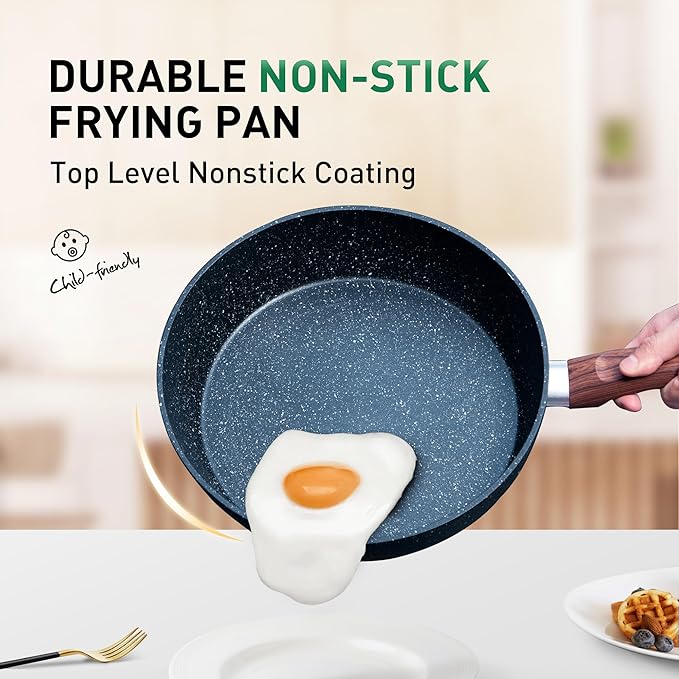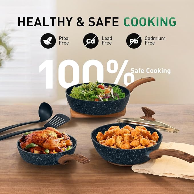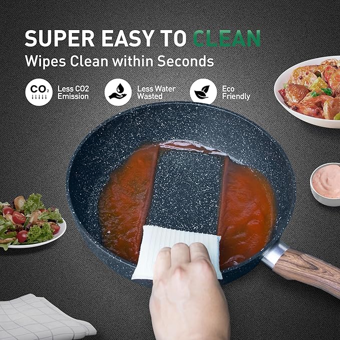 - Non-Stick Granite Coating: Our pan set interior & exterior is coated by high performance non-stick granite coating, which makes the skillet easy to cook and clean. It means less oil or butter using for healthy and better diet cooking