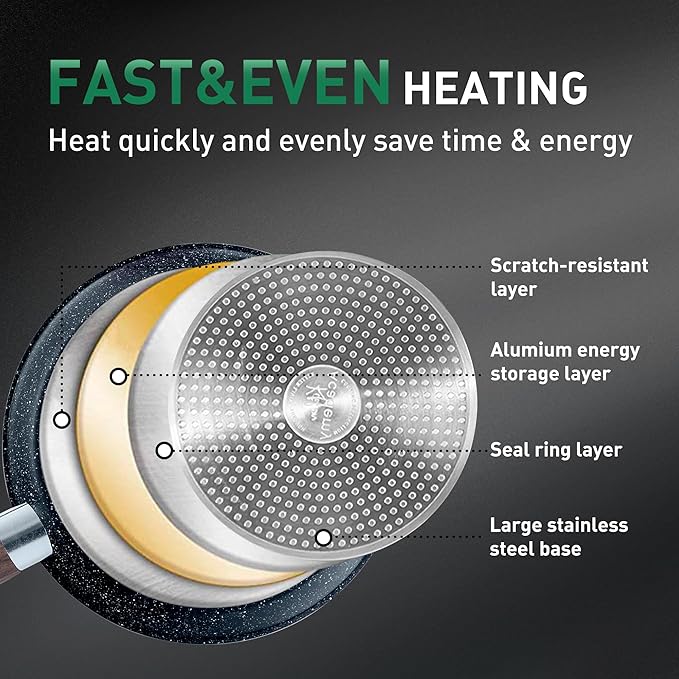 - Heats Quickly and Evenly: This cookware uses professional grade aluminum core that conducts heat quickly and evenly with precise temperature control, which will save time and energy