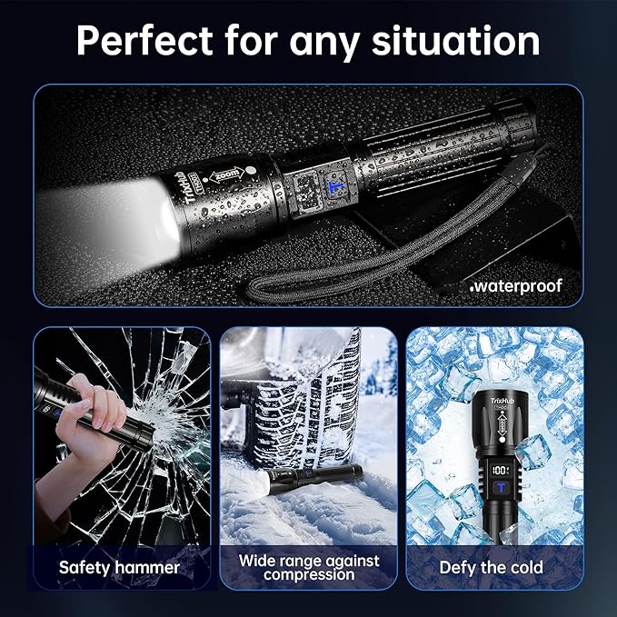 - 【USB-C Port】Super Bright flashlight offers an extended runtime of up to 12 hours on low brightness mode, long endurance and longevity. The USB Type-C fast charging function, which can be fully charged within 2 hours. Saving the cost of disposable batteries and achieving environmental protection. Rechargeable Flashlight LCD display indicates 100% to display the battery power in real-time, so that you always control the status of the flashlight and avoid the trouble of flashlights high lumens rechargeable sudden power outage.