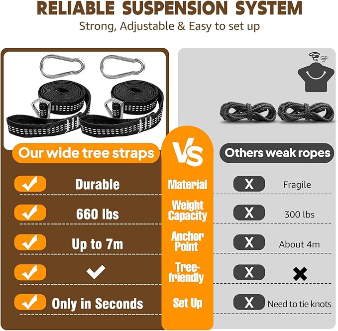 - Stability and Security:The spreader bars enhance stability, preventing excessive swaying or flipping,ensuring a secure and safe experience,especially when entering or exiting the hammock. With the included suspension system comprising two infinitely adjustable straps and two carabiners, you can easily and securely set up the hammock,promoting safe and enjoyable lounging.The suspension system's carabiners further enhance safety by offering reliable and secure attachment points.