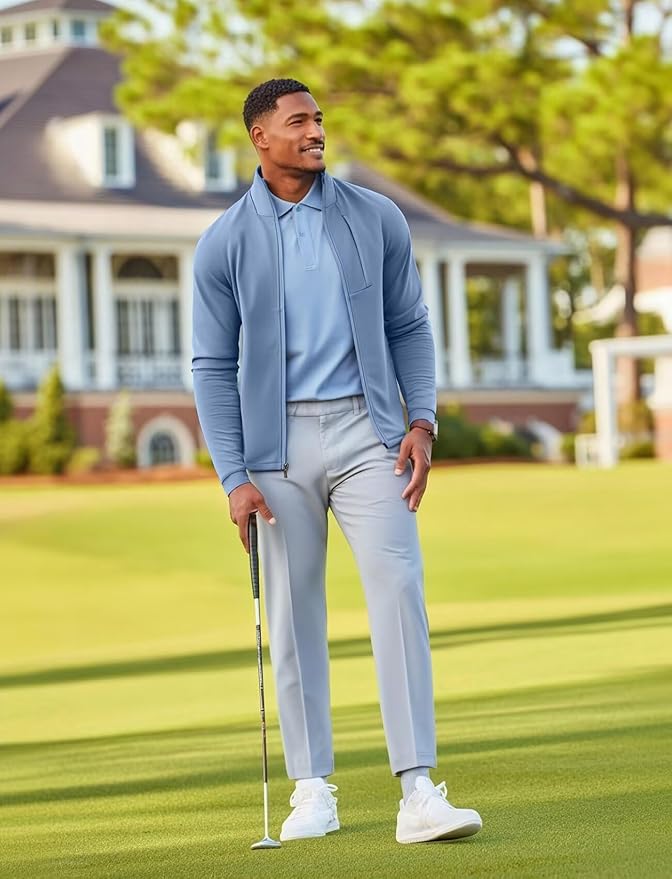 - Full-Zip track jacket men: Made from textured knit fabric, this jacket offers added style and comfort. It is mid-weight, comfortable, stretchy, breathable, and windproof.