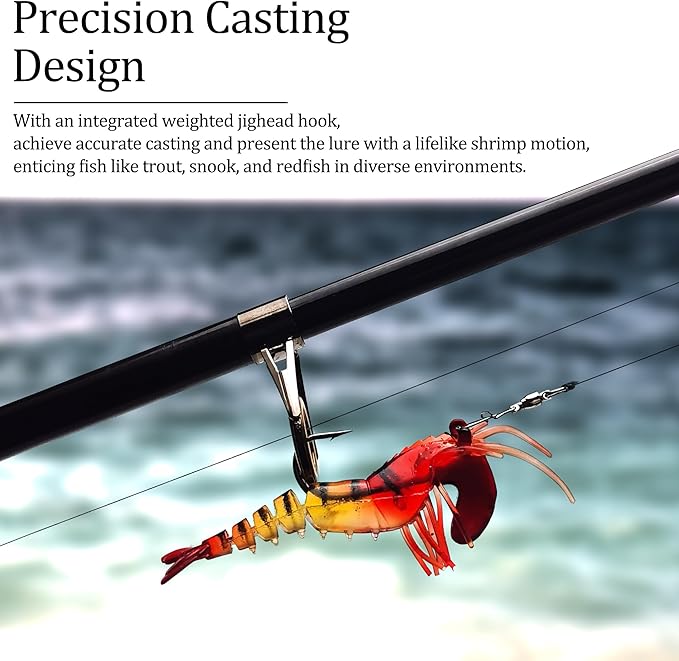 - "【Widely Fishing Targets】VMSIXVM jointed shrimp lures feature proven deadly attraction patterns to match natural food sources, making them versatile and effective for a wide range of fishing situation. Widely used in the stream, lake, river, sea, perfect for freshwater and saltwater. Shrimp baits is a very useful meal for almost all fish, especially for bass, trout, crappie, perch, walleye, pike, salmon, redfish. To catch more fish over a wider target than any other lures on the market!